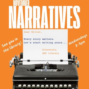 Join your GHC library for November Narratives every Wednesday this month from 2–3 p.m. in the library, where students can relax, write, and create together. This event is happening across all 4 GHC Libraries!